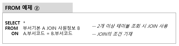 1) FROM절 SELECT절과 함께 사용 조회하고자 하는 컬럼들이 있는 테이블명 기재 여러 개의 테이블을 통해 조회하고자 할 때에는 JOIN ON절 활용 FROM 예시 2) WHERE SELECT와 FROM절 다음에 사용 원하는 데이터만 출력될 수 있도록 조건을 입력하여 데이터의 양을 제한하는 기능 조건이 2개 이상인 경우 AND 또는 OR 사용하여 작성 (A AND B는 A, B 조건을 모두 만족, A OR B는 A 또는 B 중 하나라도 만족) 우선순위가 필요한 경우 괄호를 사용 WHERE 예시 3) 비교연산자 범위를 정하거나, 같거나 같지 않은 데이터를 찾을 때 사용(조건문) SELECT 하고자 하는 데이터의 행 수를 줄이기 위해 필요 먼저 실행하고자 하는 조건을 ()로 우선순위를 정할 수 있음 실..